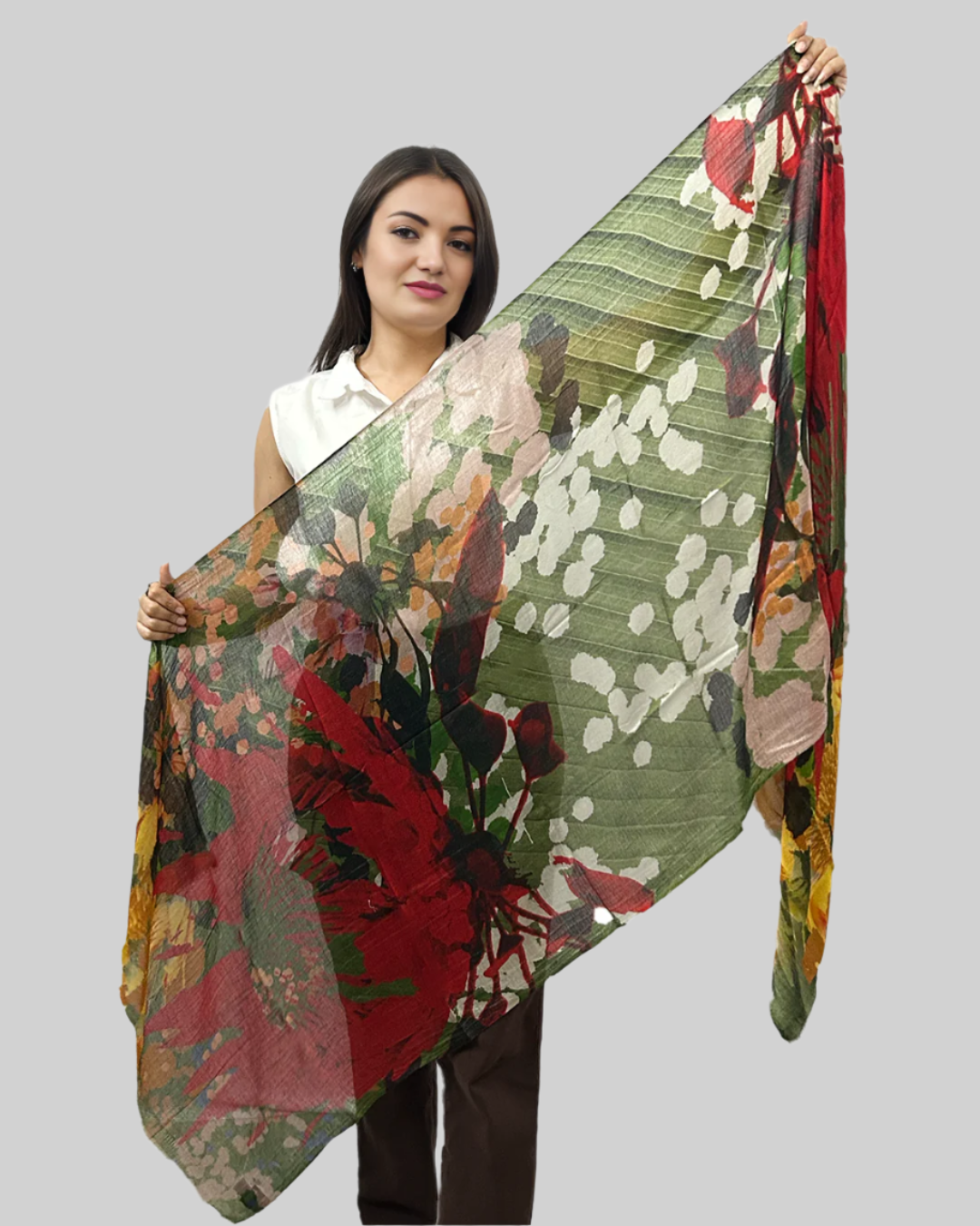 Add a splash of color to your wardrobe with this 100% Micro Modal Scarf, featuring a striking floral abstract design. The vibrant mix of orange, green, blue tones makes it a versatile accessory for all seasons. The ultra-soft micro modal fabric offers a luxurious drape and feather-light feel, ensuring all-day comfort and elegance.